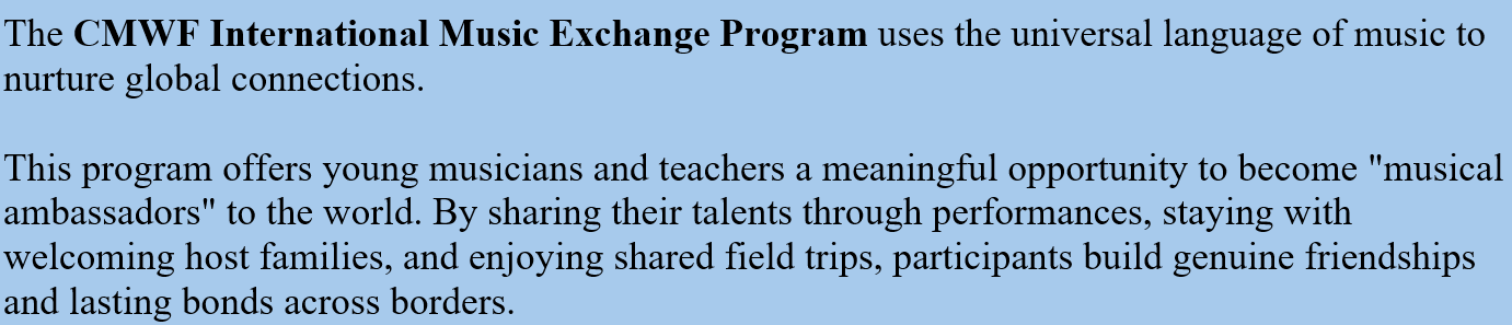As part of the CMFW’s International Music Exchange program, the students from the Robert Schumann Conservatory in Zwickau, Germany, will visit and perform at several Austin schools during their 13-day visit to Austin: